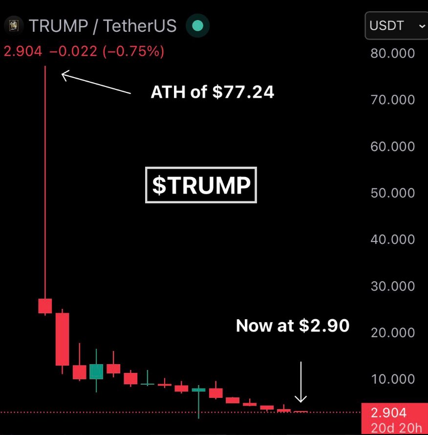 TRUMP coin price plummeted from ATH to $2.90, leaving a $10,000 investment at only $370.