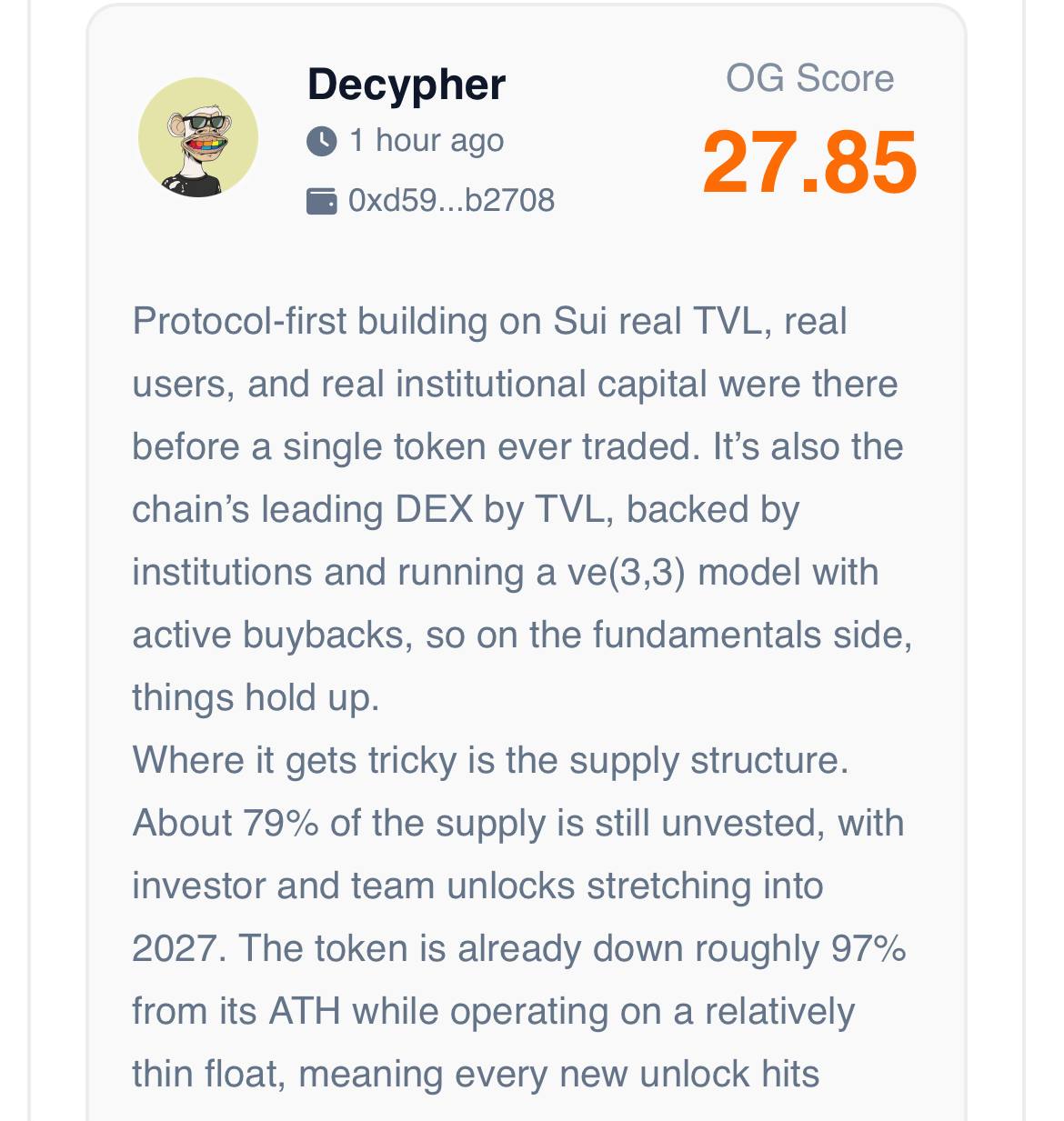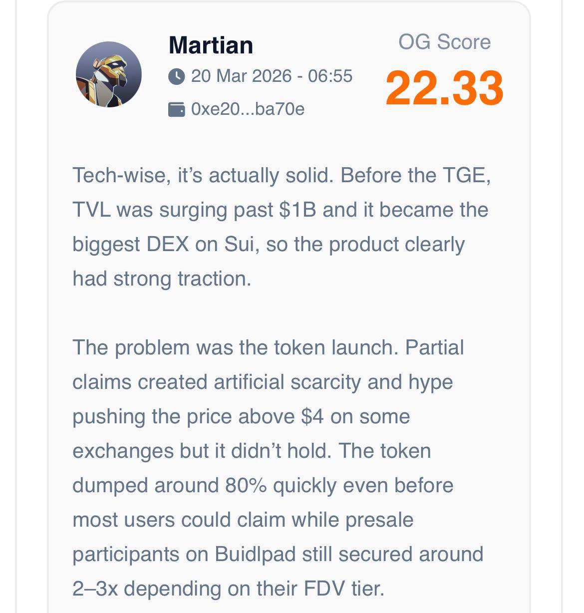 Our OG expert reviewers note that Momentum $MMT launched with strong fundamentals, real TVL and early traction as a leading DEX on Sui but tokenomics and supply structure create significant pressure.