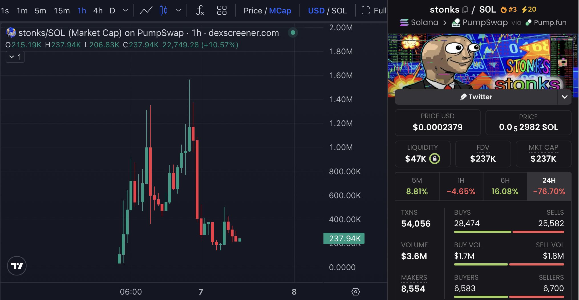 STONKS (STONKS) is a cryptocurrency launched in 2025and operates on the Solana platform. STONKS has a current supply of 1,000,000,000 with 0 in circulation. The last known price of STONKS is 0.00035956 USD and is up 5.11 over the last 24 hours. It is currently trading on 39 active market(s) with $22,714.12 traded over the last 24 hours. More information can be found at https://mystonks.org.