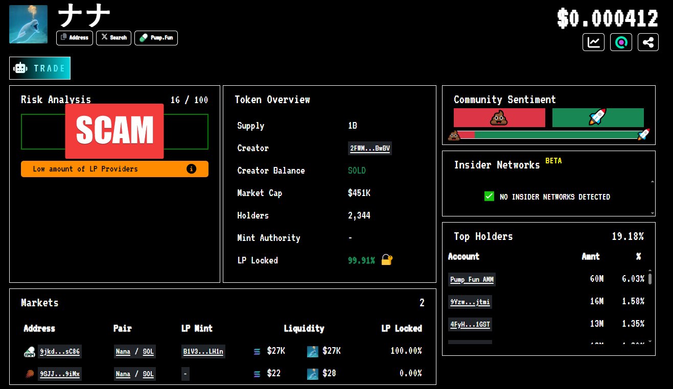 $Nana ALERT SCAM SOLANA 🚨\nName:ナナ\nAddress: BWJ7zJauzatao4FsBnGdVsqdBi3k5NbgSY62noZApump\n💰Market Cap: $412,000 USD\n👥Total Holders: 2300\n🔝Insiders: 100.00%\n🖌️Creator: 2FWMpthyEJ3AGsq61TogQevJT5S5sU8bTngsDtgwBwBV https://t.co/g1nTl5yYT7