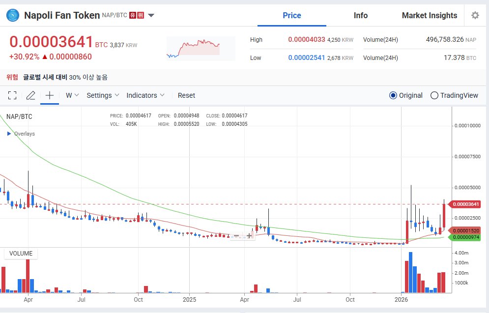 $NAP: It's been two months since Upbit deactivated deposits for Napoli Fan Token and issued an investment warning for the pair. Still, it continues to go up, now approaching its highest price of the last two years. NAP is trading at $2.51 on Upbit and at $0.33 elsewhere. https://t.co/QJRVk8zN4L