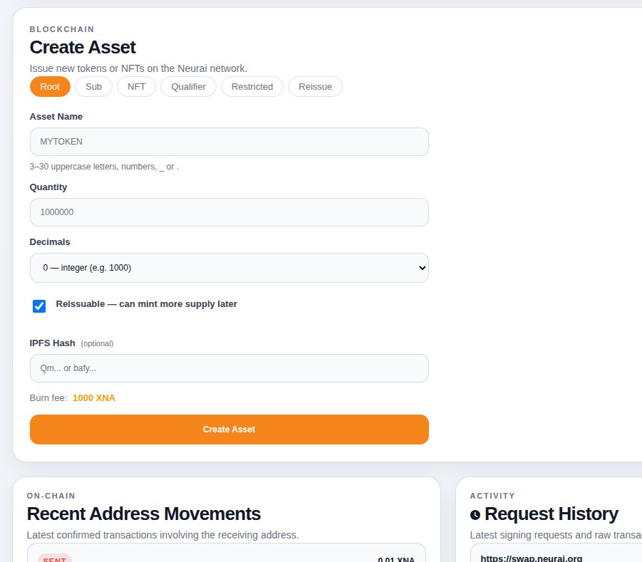 Neurai network simplifies the asset creation process, allowing easy token or NFT issuance via the web.