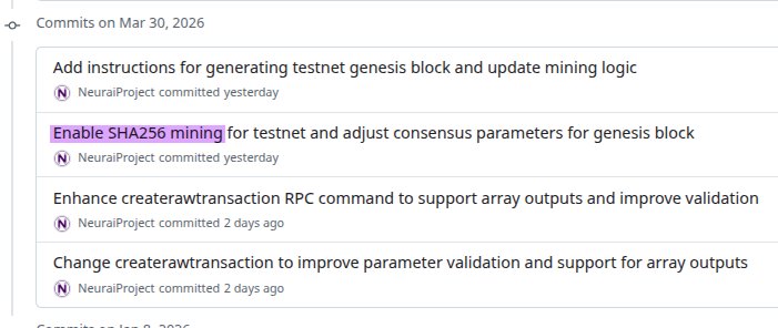 We have updated the experimental code for the Neurai node to incorporate SHA256 mining into the Testnet network, thereby enabling it to operate without significant energy costs.
