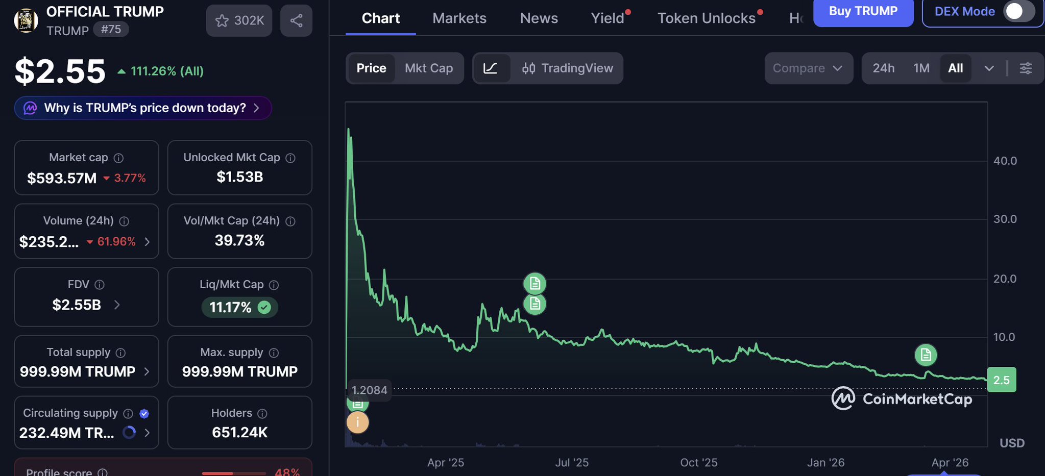 #TRUMP Memecoin Extends Decline Despite High-Profile Investor Event.