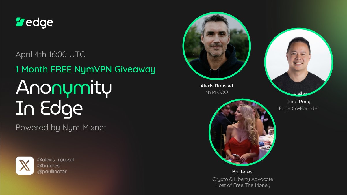 📅 Mark your calendars for our Anonymity in Edge AMA this Thursday, April 4th with Edge CEO @paullinator, @alexis_roussel, and guest moderator @briteresi. \nTune in to learn more about @nym Mixnet in Edge and for your chance to win a free month of NymVPN! https://t.co/loX2E72T05