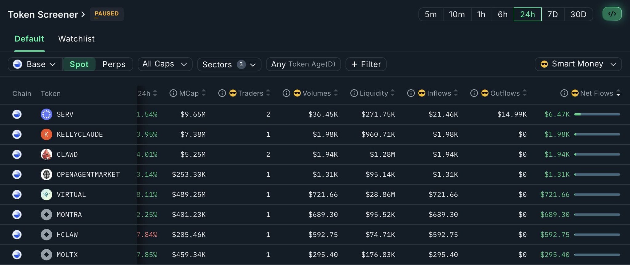 Aside from $SERV (@openservai) — clearly getting some attention with agent launches on the board — everything else is pocket-sized flow.
