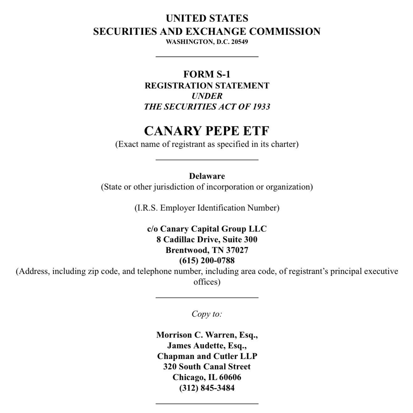 SEC filing in the United States shows a new S-1 registration statement proposing the establishment of a “Canary Pepe ETF”.
