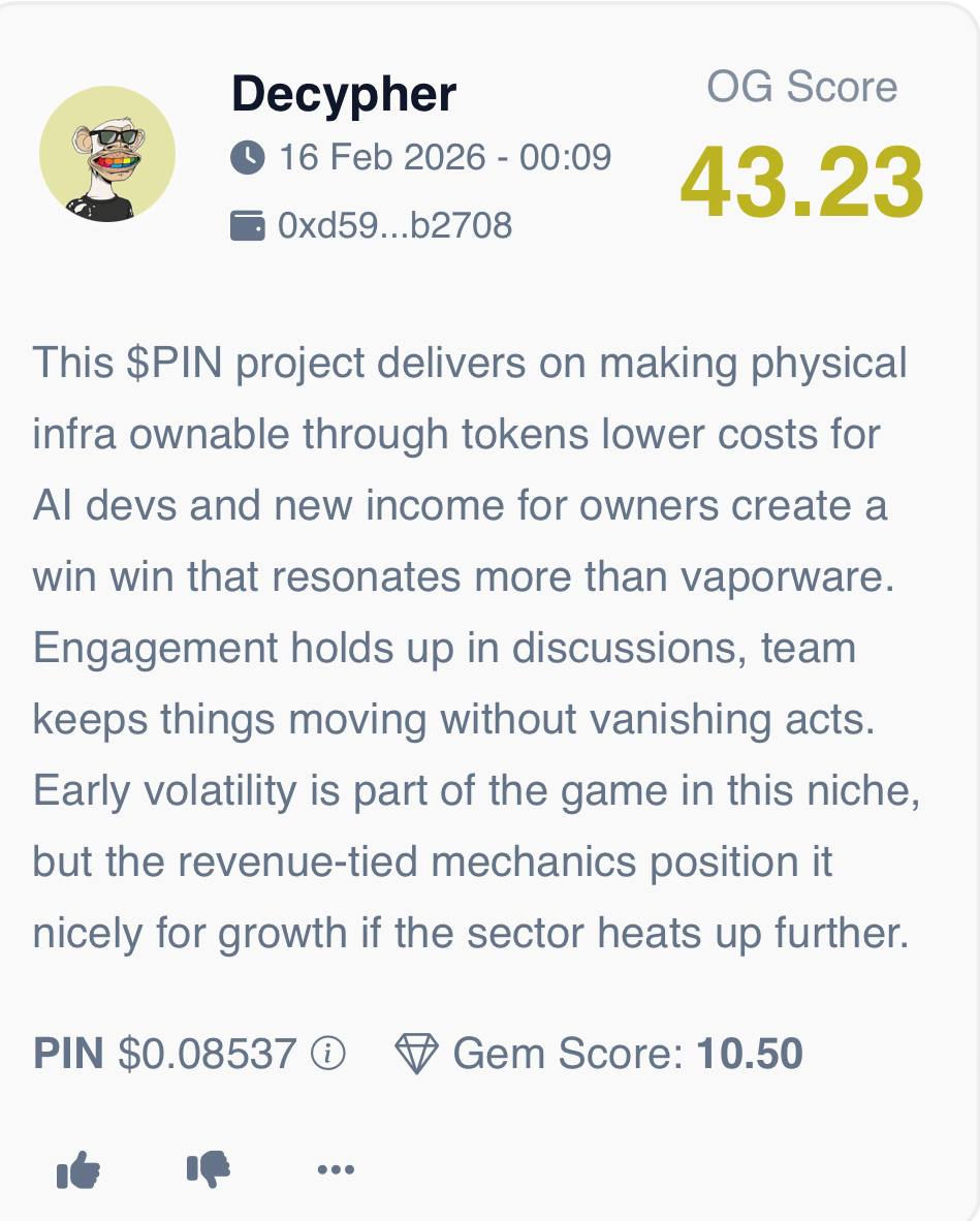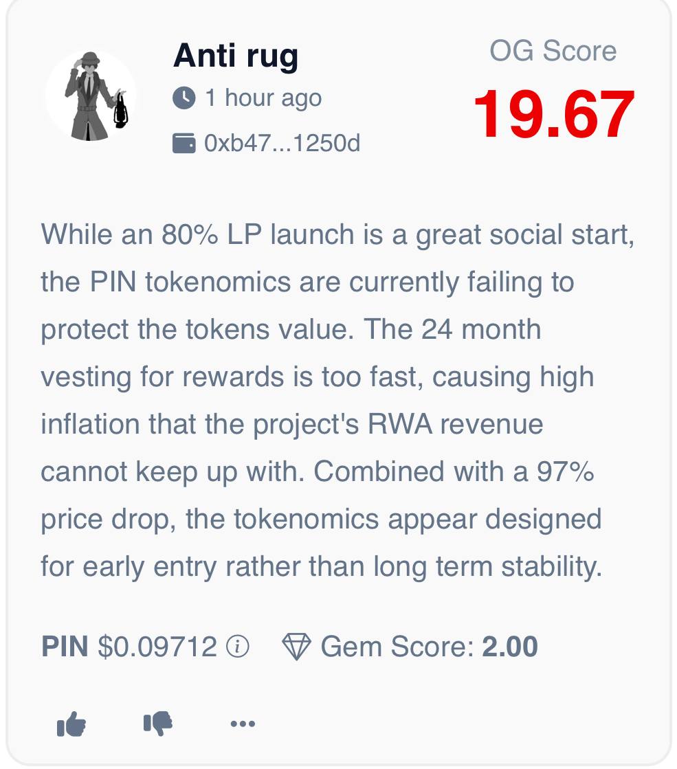Our OG experts note that Pinlink $PIN introduces a compelling model by tokenizing physical infrastructure for AI but fast reward vesting and high inflation have pressured the token’s value.