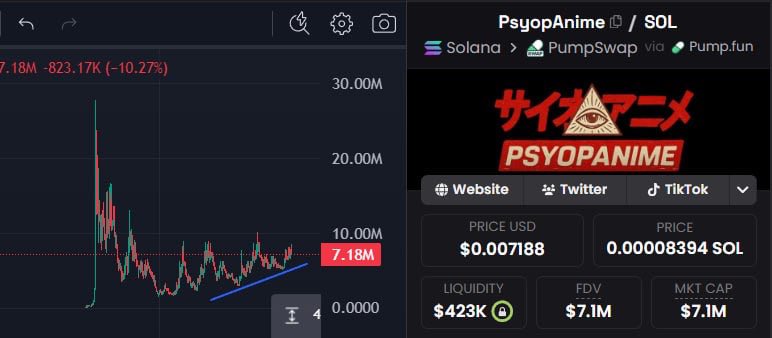 The author is bullish on PsyopAnime on Solana, the chart shows positive momentum, the community is active, and it features unique AI anime art.