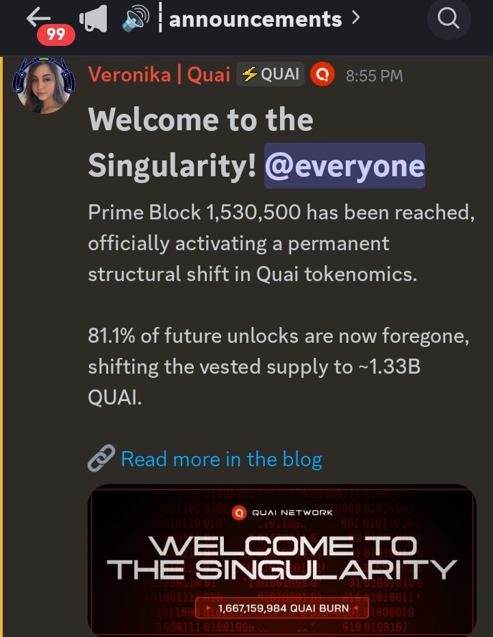 Quai Network singularity fork is live, burning over 1.6 billion QUAI, significantly reducing future unlocked supply, increasing token value.