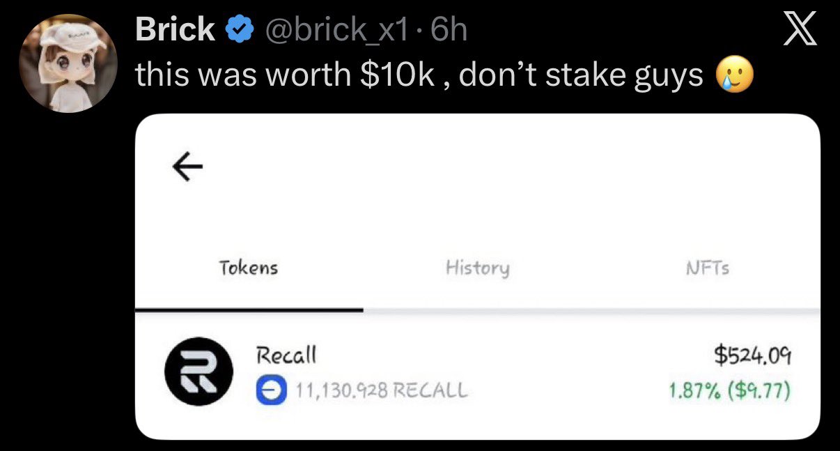 Airdrop token Recall plummets in value, tweet warns not to stake or hold airdrop coins.