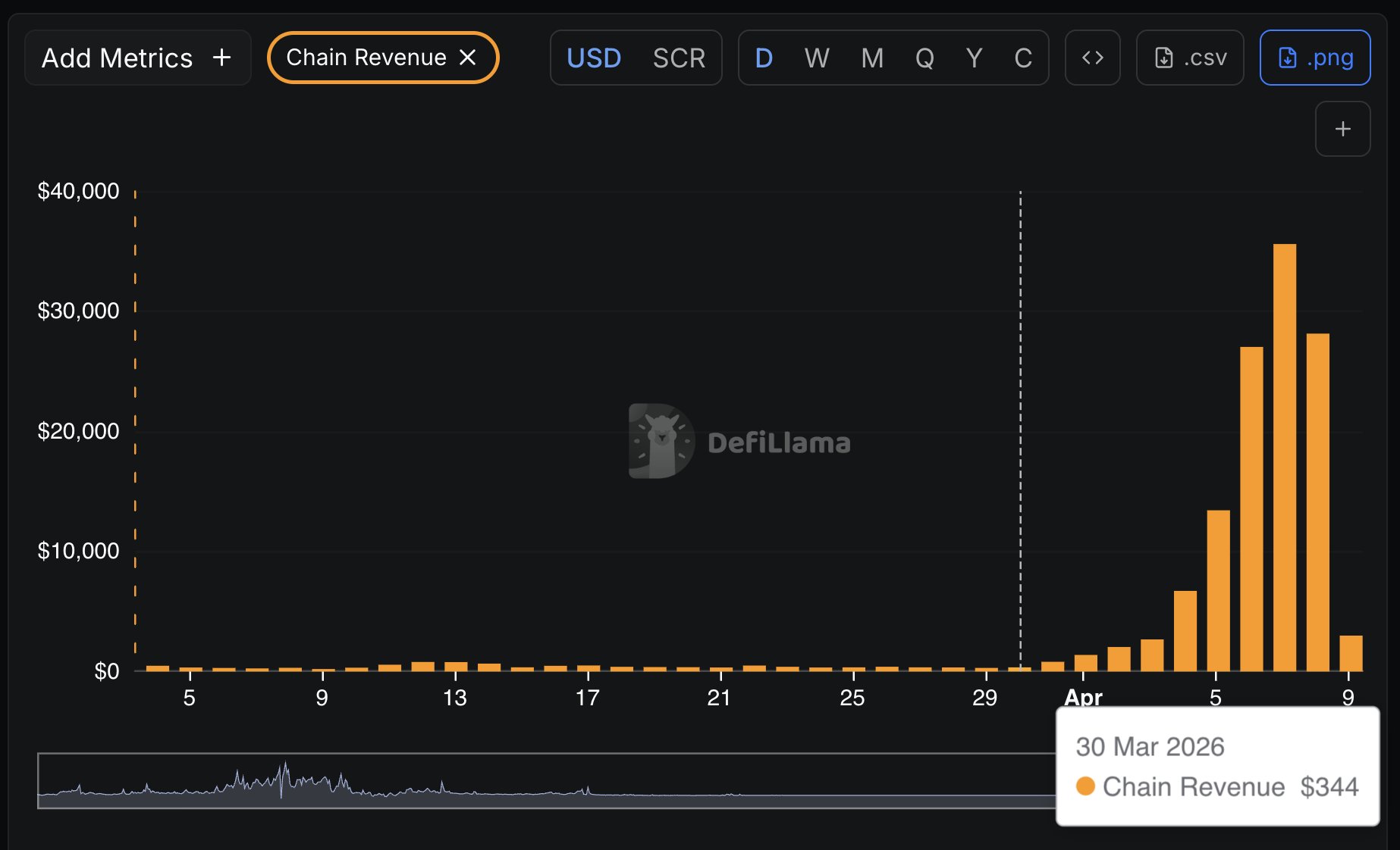 Chain’s daily revenue change: $340 → $35k