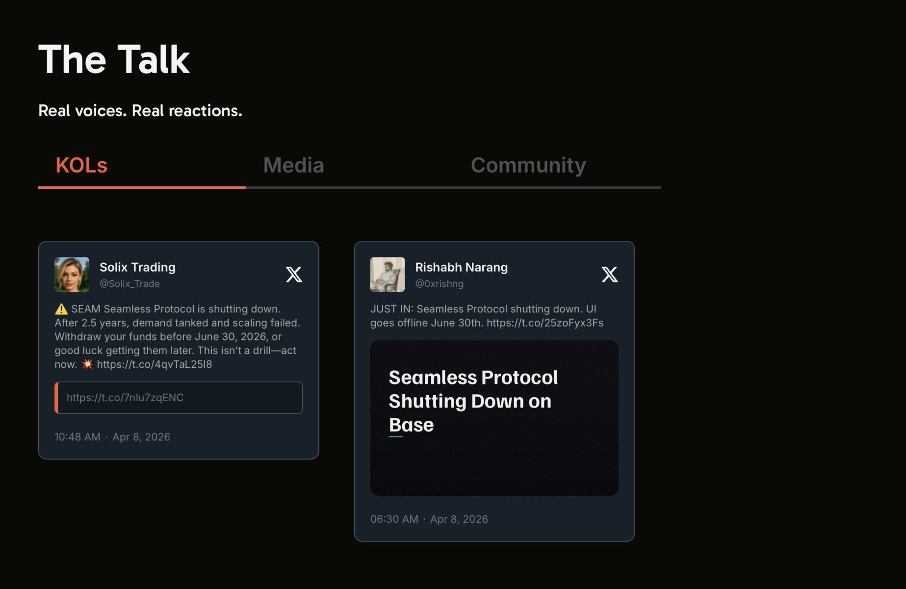 Wu learned that the Base ecosystem DeFi lending protocol Seamless Protocol has announced the initiation of a shutdown process, with the front‑end interface scheduled to go offline on June 30, 2026, and the team will cease support at that time. The project team reminds users to complete asset withdrawals, leveraged token redemption, and SEAM unstaking before then. The team states that the closure is primarily due to the leveraged token product failing to find product‑market fit (PMF), while the DeFi lending market suffers from insufficient borrowing liquidity and narrowed yield space, resulting in a lack of sustainable revenue for the protocol. Remaining DAO treasury assets will later be allocated to SEAM holders via a governance proposal. https://t.co/7hdlHpkUU1