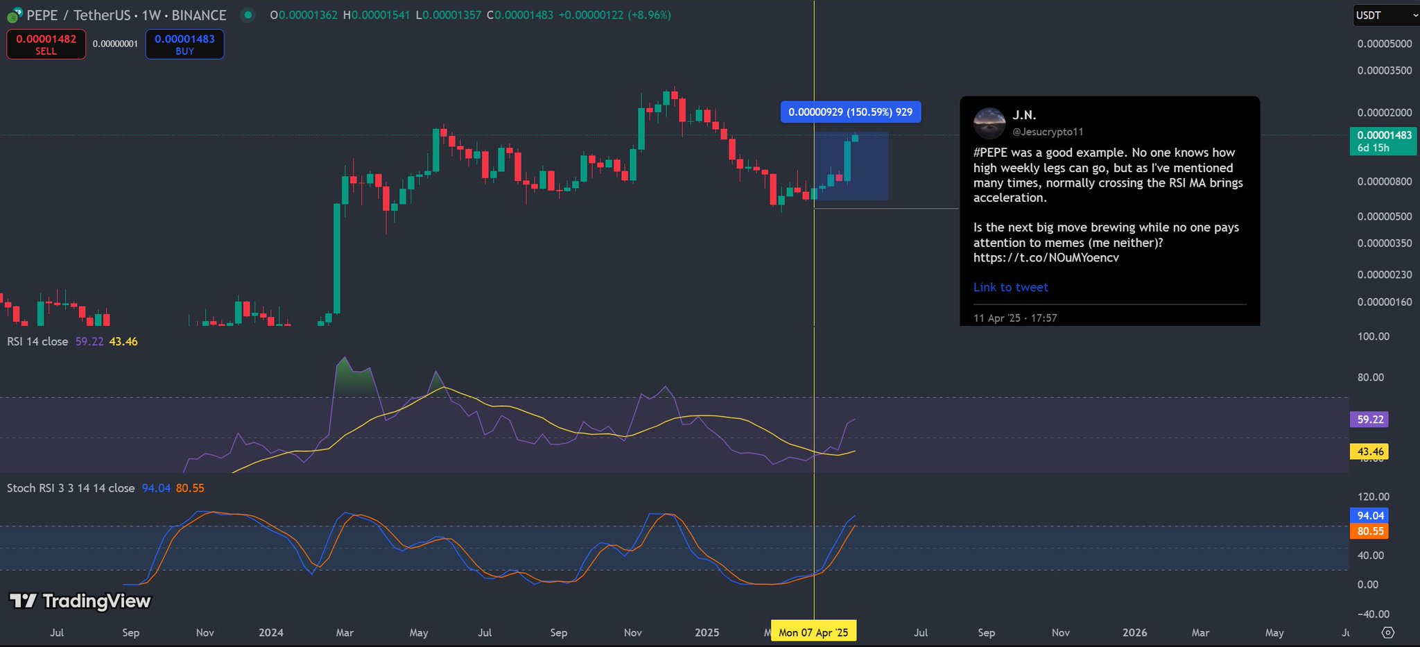 $PEPE Exploding. The charts were hinting and this coin likes to move explosively. Strong weekly cycle ahead for this one.