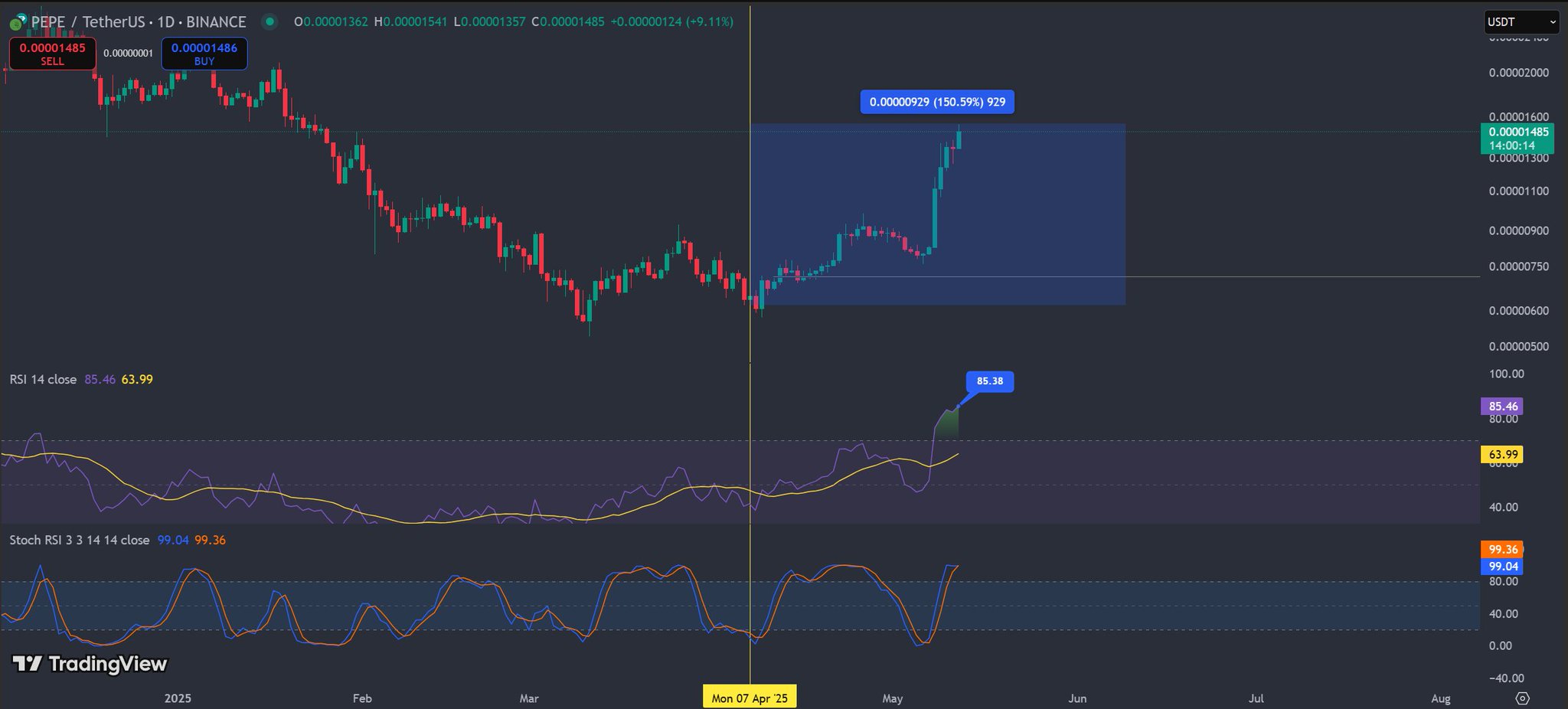 PEPE is experiencing an explosive rise, with technical indicators showing a strong weekly cycle, and a possible short-term pullback.