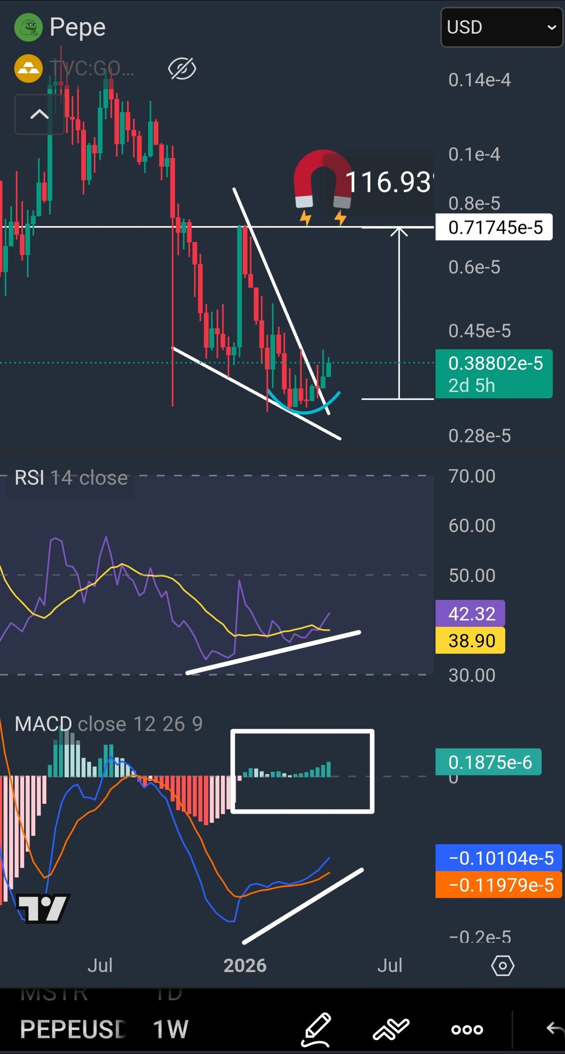 PEPE has broken out of a descending wedge, with RSI and MACD showing strong bullish divergence, indicating potential for a substantial rally.