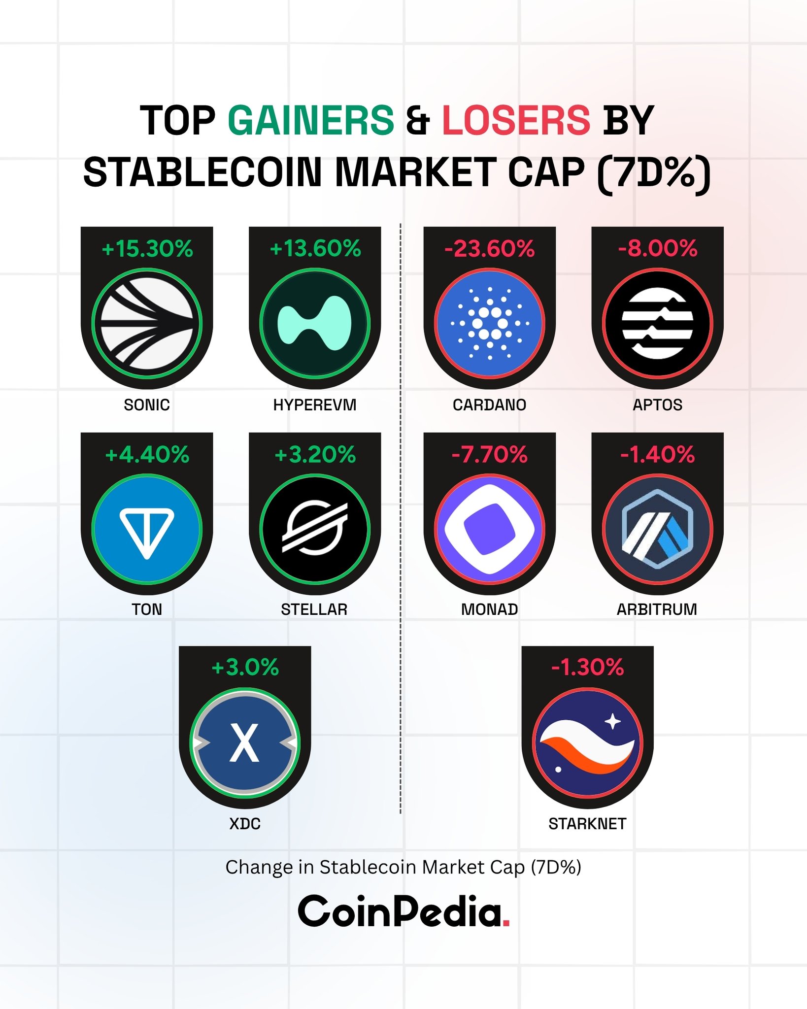 🔹Over the past 7 days, @SonicLabs and @HyperXEVM led stablecoin market cap growth with gains of 15.30% and 13.60%, followed by @ton_blockchain, @StellarOrg, and @XDCNetwork.🔹