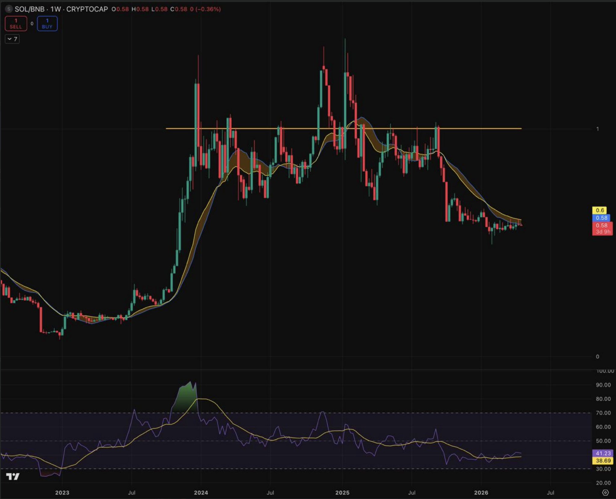 币安被指操纵市场阻止SOL超越BNB,SOL/BNB比率图表呈下降趋势。
