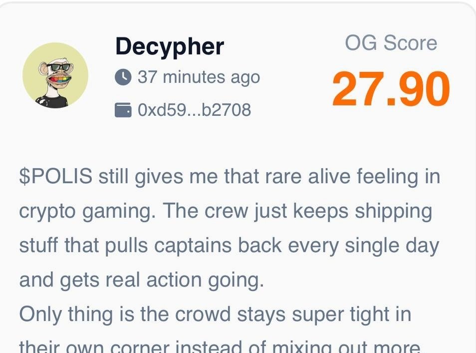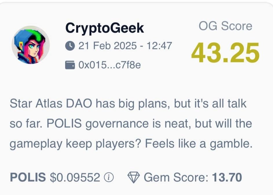 Our OG reviewers note that Star Atlas DAO (POLIS) shows strong consistency in development and an engaged core community, but concerns remain around limited reach.