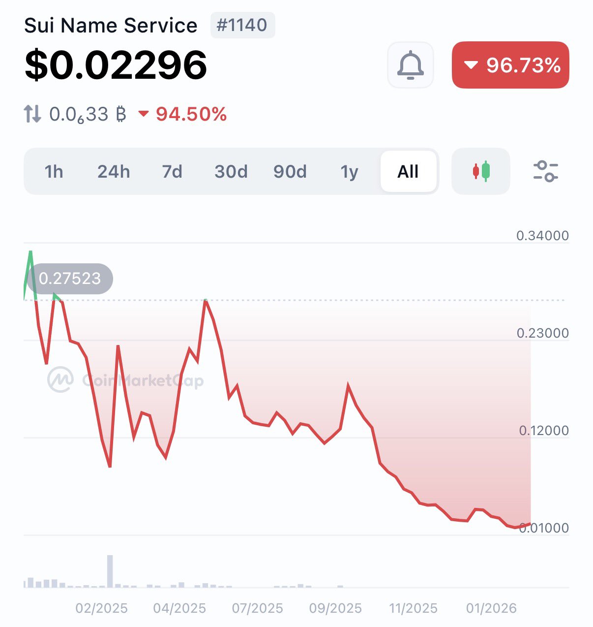 Sui Name Service (NS) price plummeted over 94%, resulting in heavy investment losses.