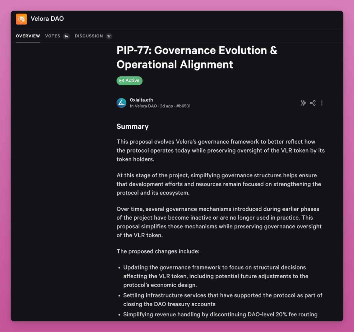 Velora DAO approves its closure with 65.8% of votes and transfers $415,000 to Laita Labs, eliminates staking and leaves the VLR token solely for governance.