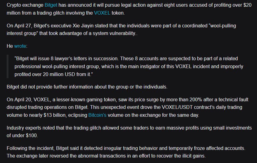 On April 20 2025 a bug in Bitget's market making bot caused the VOXEL/USDT pair to bounce between $0.125 and $0.138 every few seconds like clockwork
