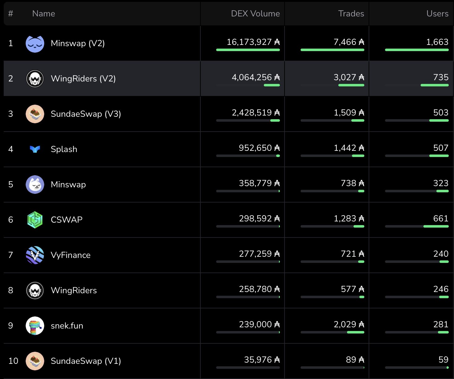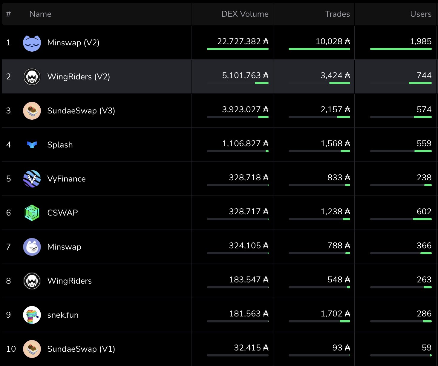 WingRiders ranks among the top Cardano DEXs in terms of volume and users, delivering strong performance.