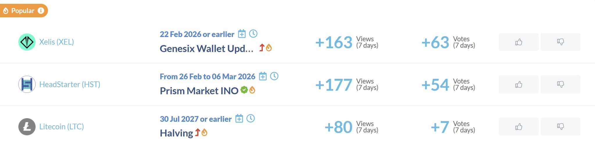CoinMarketCal listed recent popular events for XEL, HST, and LTC, including wallet updates, INO, and halving.
