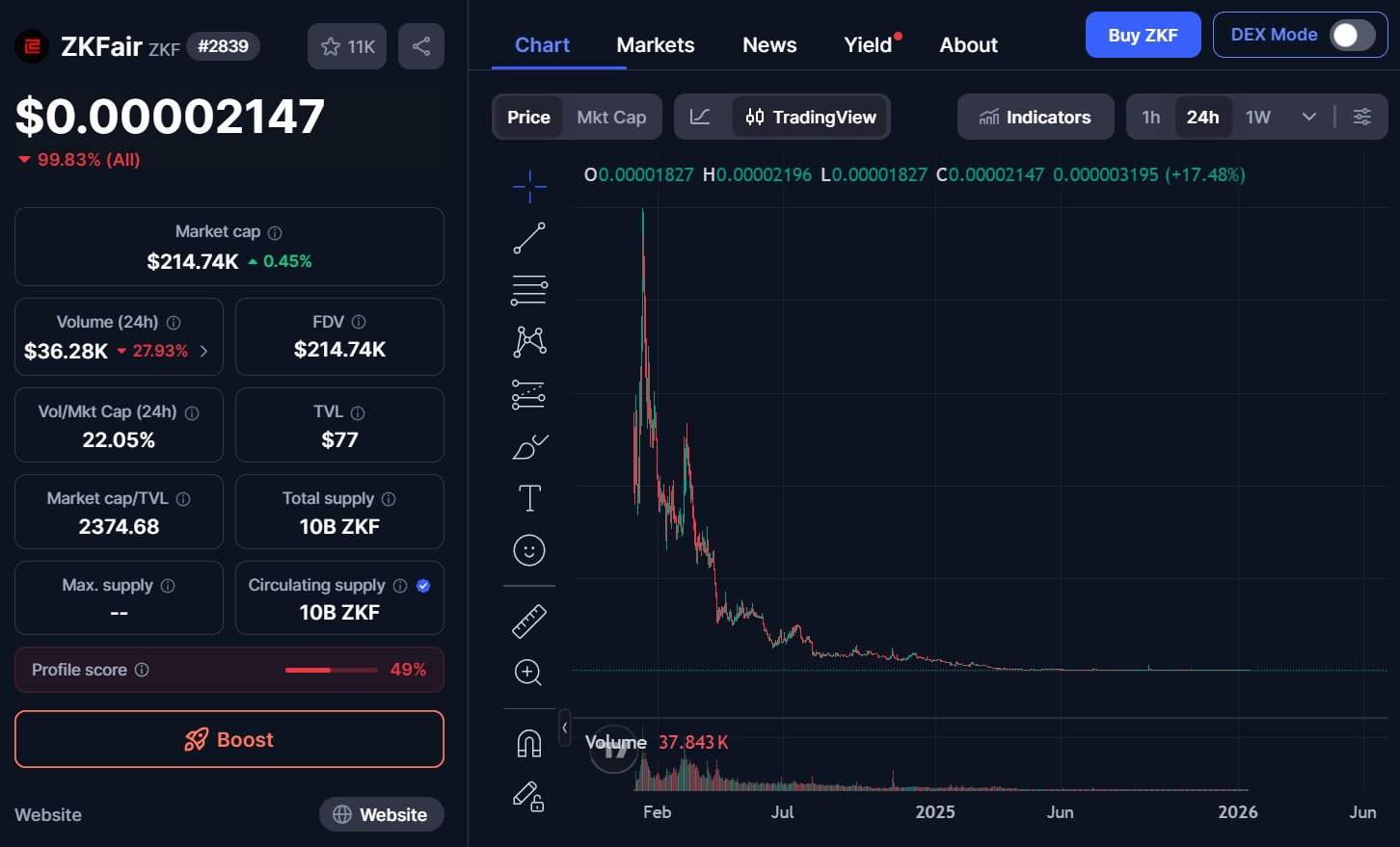 The $ZKF token has been completely milked: from $250M FDV two years ago to around $200k FDV now (-99.9%).