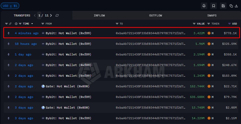 onchainschool.pro OnChain_Analyst Educator A6.03K @how2onchain$H: WITHDRAWN FROM CEX Just now, $800K worth of $H was withdrawn from #Bybit to this wallet This marks the third consecutive day of similar transfers Over the past 3 days, a total of ~$6.2M has been moved off exchanges Notably, there are multiple wallets that have been withdrawing $H from exchanges over time - potentially indicating coordinated activity Historically, similar patterns have ended with sharp downside moves Wallet: 0xbaAb7211438F33bE0344d57978C7571f2d797ab2