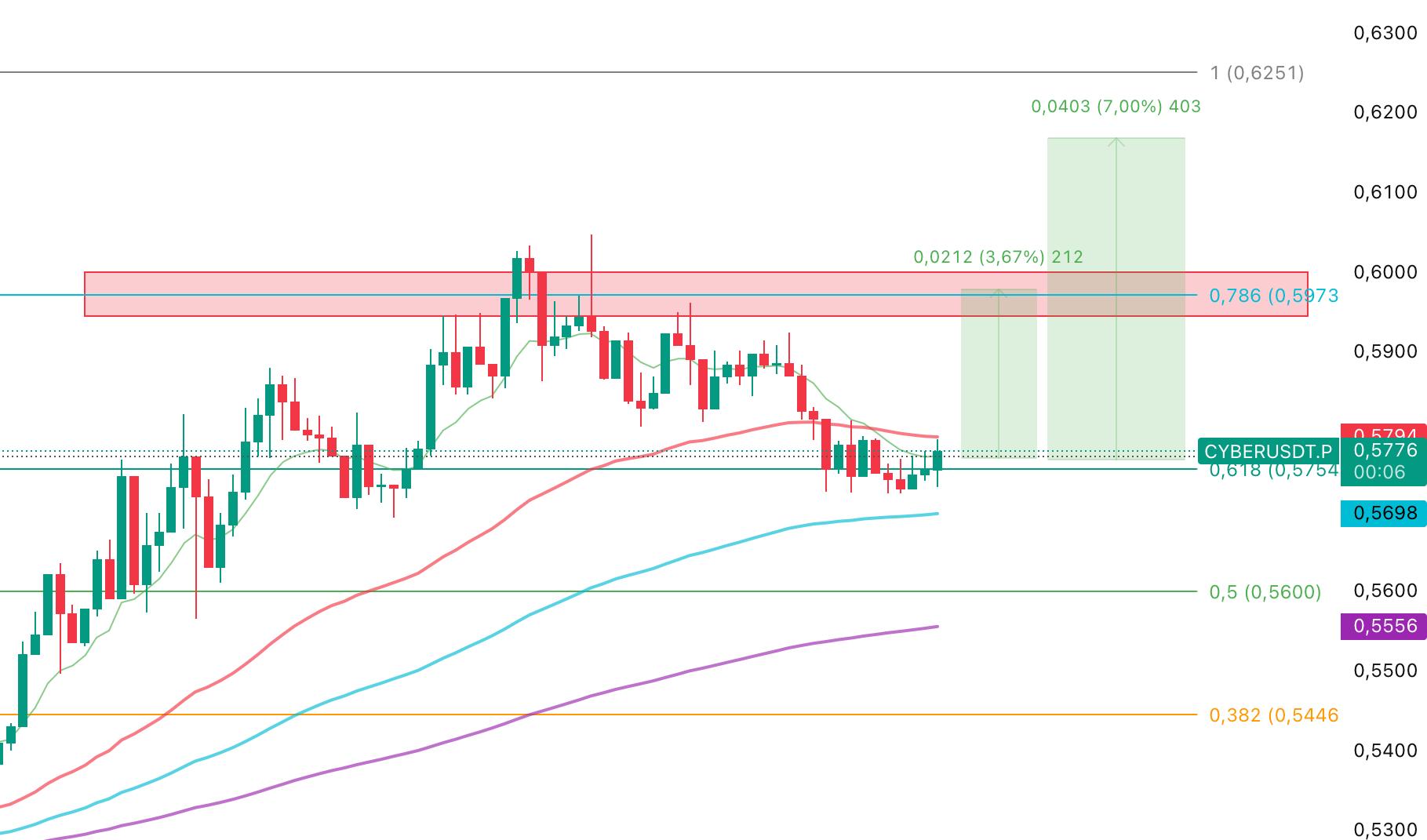 gorkeu TA_Analyst Trader B17.62K @Gorkeu#CYBER 05776 | 15M In order for the rise to continue, the 0.59-0.60$ range must first be retaken. If hourly closes occur above this band, momentum will strengthen and the upward movement will become clearer. In the short term there is strong seller pressure (red box area); if these levels are breached, a positive divergence may begin and the potential for the price to move higher increases. For an upward crossover of the EMAs on the 15‑minute chart, sustained moves at or above at least $0.5825 are required.