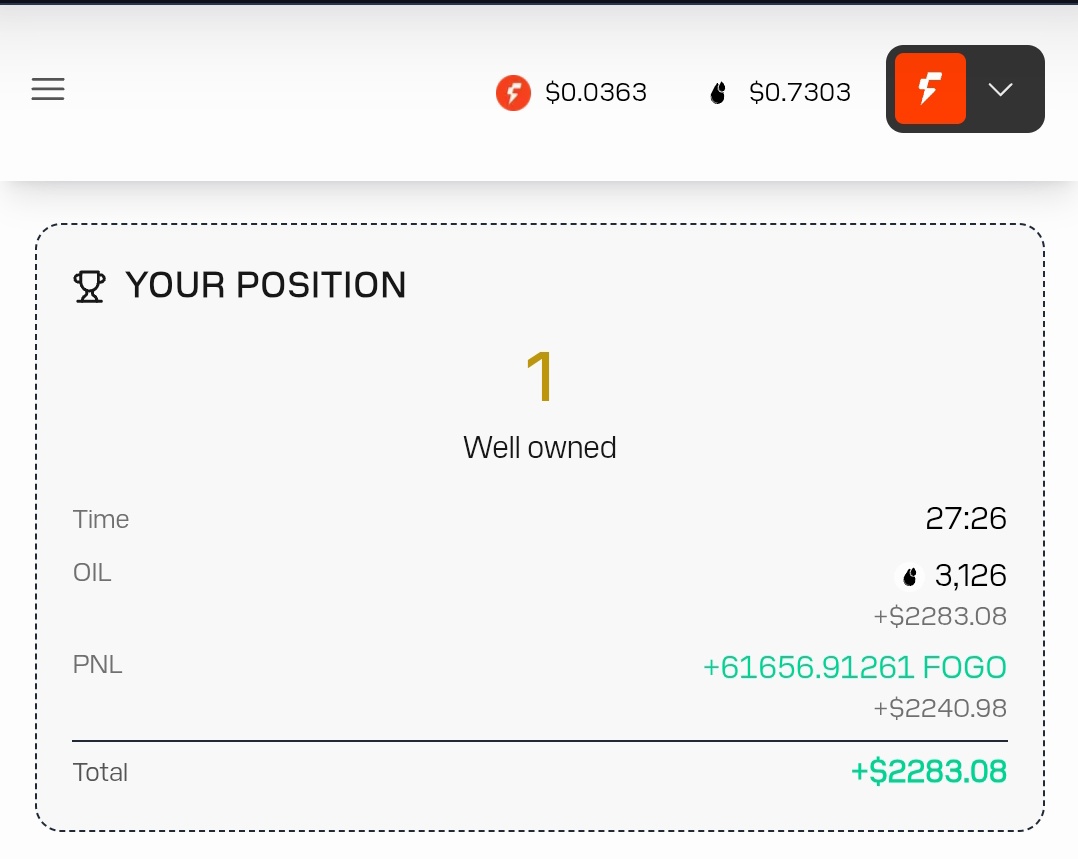 🌱Smartcoded.fogo (Mainet $/acc) FA_Analyst DeFi_Expert A5.68K @smartcodedgM Web3 ☀️ I know you've Been waiting for me to share this one. @OnchainOil is finally live on Fogo testnet and I'm already in there testing. For those who don't know, this isn't just a game. It's a DeFi protocol built natively on Fogo. Here's how it works: → Bid $FOGO to operate one of four OIL wells ↳ Wells run on Dutch auction mechanics, prices start high and decay over time ↳ As the operator, you passively mine $OIL tokens in real-time ↳ Someone can outbid you and take over, but you get 86% of your FOGO back Four well tiers: → Seep (entry level) ↳ Flow (mid tier) ↳ Gusher (higher output) ↳ Blowout (maximum mining rate) Why I'm paying attention: → 28-day halving cycles for mining rewards ↳ Early operators eat the most before halvings kick in ↳ 100% onchain and verifiable ↳ $0 gas fees with Fogo Sessions I've Already secured a Blowout well on testnet. The real question now is, when mainnet? I Can't wait for this one to go live. If you want to start testing → https://t.co/9rkfrX64DN Stay Fogoliz