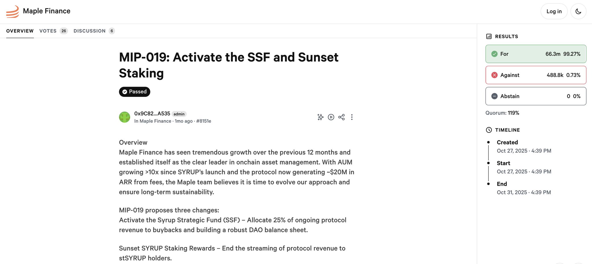 DeFi Dad ⟠ defidad.eth DeFi_Expert Educator C176.51K @DeFi_DadICYMI in October, this proposal passed in a @maplefinance governance to end streaming protocol revenue in the form of SYRUP to stSYRUP holders. Instead, 25% of ongoing protocol revenue will be allocated to the Syrup Strategic Fund (SSF) for SYRUP buybacks. Do we expect more DeFi protocols to focus on buybacks like this vs streaming token rewards, or is this unique to a high-growth, profitable protocol like Maple? Btws, Maple hit $2.11M monthly protocol rev in November, it's second highest of the year after October. That's $25M ARR if they can sustain it.