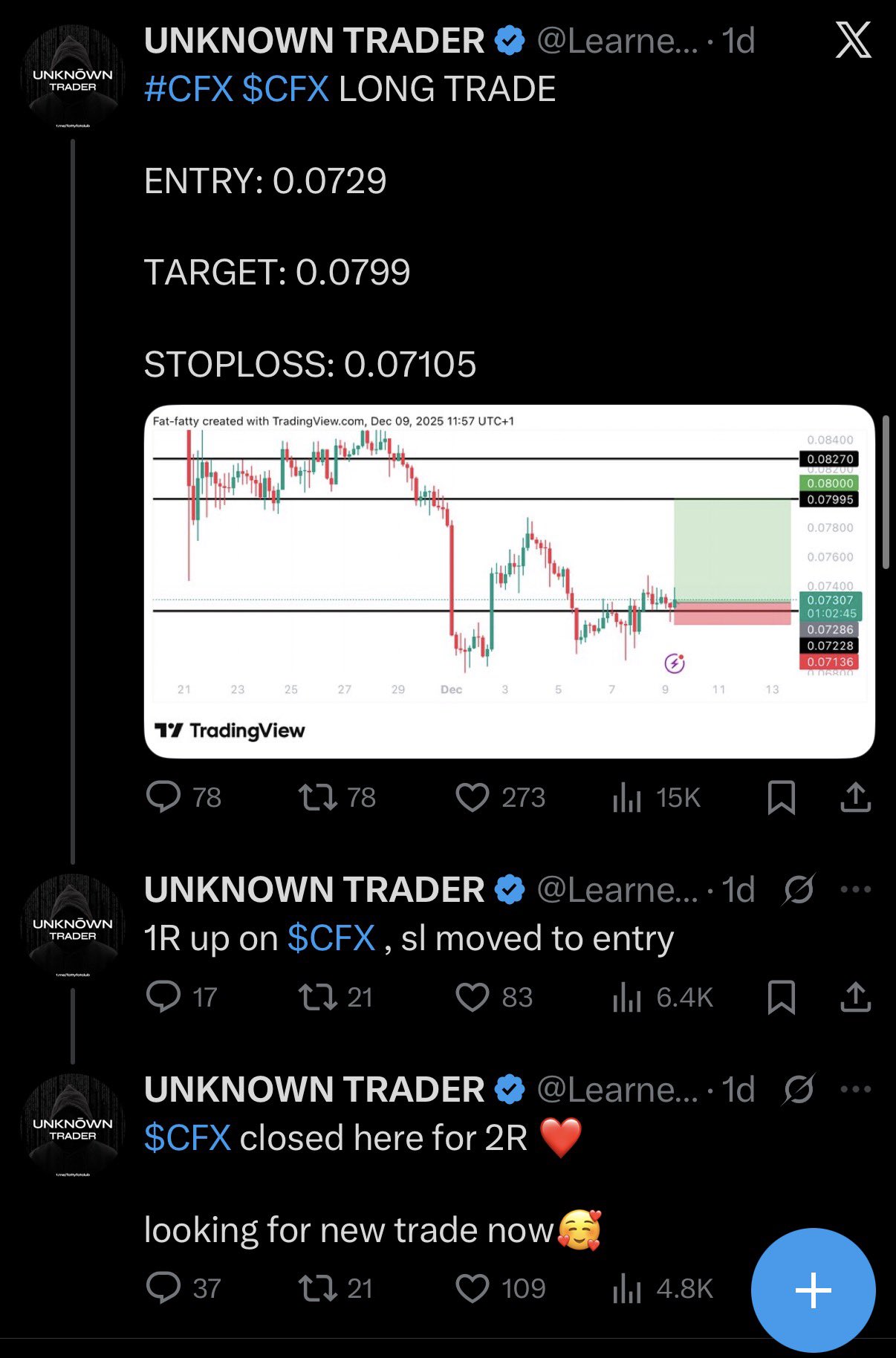 UNKNOWN TRADER Trader TA_Analyst B119.38K @Learnernoearner#CFX $CFX LONG TRADE ENTRY: 0.0729 TARGET: 0.0799 STOPLOSS: 0.07105 https://t.co/y8lo1n5Du7