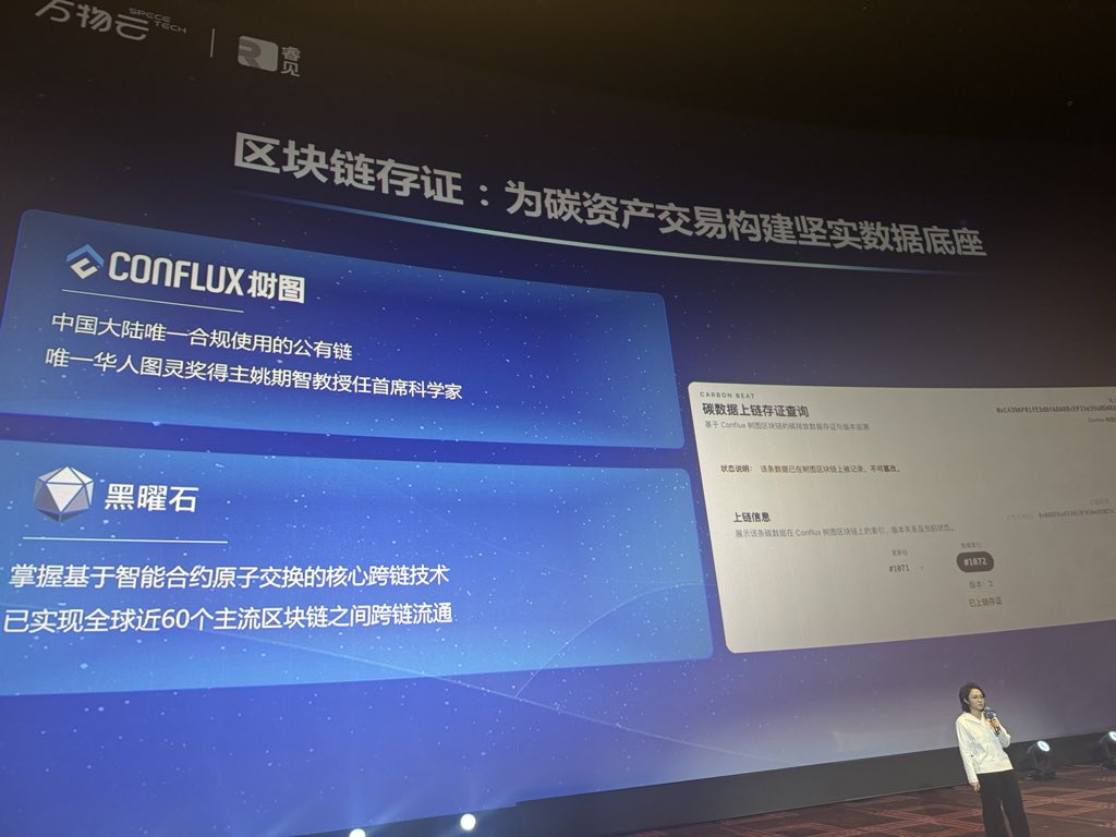 Cike@Conflux D299 @CikeinWeb3I was honored to be invited to attend Wanwu Cloud's Vision Conference 2025 yesterday. Wanwu Cloud (formerly Vanke Property) has approximately 6,000–7,000 residential projects and 2,000–3,000 commercial projects nationwide, generating hundreds of thousands of carbon emission‑related data points each year, all of which will be stored on the Conflux Tree Graph blockchain. In the future, we will also connect with carbon emission notarization agencies to put relevant certifications on-chain, achieving a more transparent and standardized data disclosure system. Recently there has been a lot of noise in the industry, but we continue to seek cooperation directions with real significance. Although the web3 industry in some ways runs counter to ESG principles (e.g., POW mining), blockchain as an underlying technology can still play a positive role in the ESG framework, such as reshaping data credibility and enhancing cross‑entity collaboration efficiency. Being able to do something truly valuable in this direction is one of the reasons we persist in exploring.