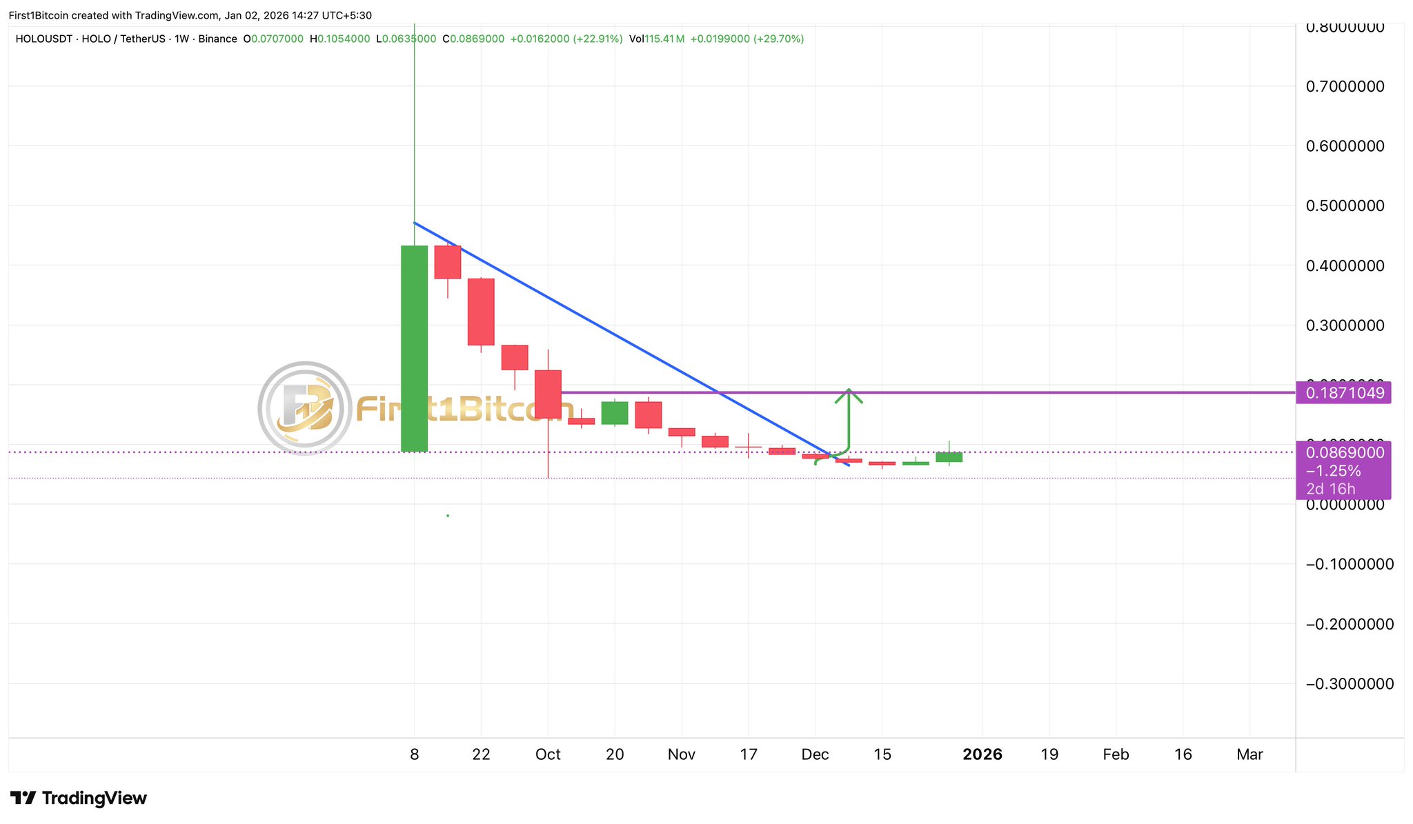 3 0 955 閱讀原文 >釋出後HOLO走勢極度看漲After a long-term decline of HOLO, technical analysis indicates that breaking the trend line will result in a sharp rise.