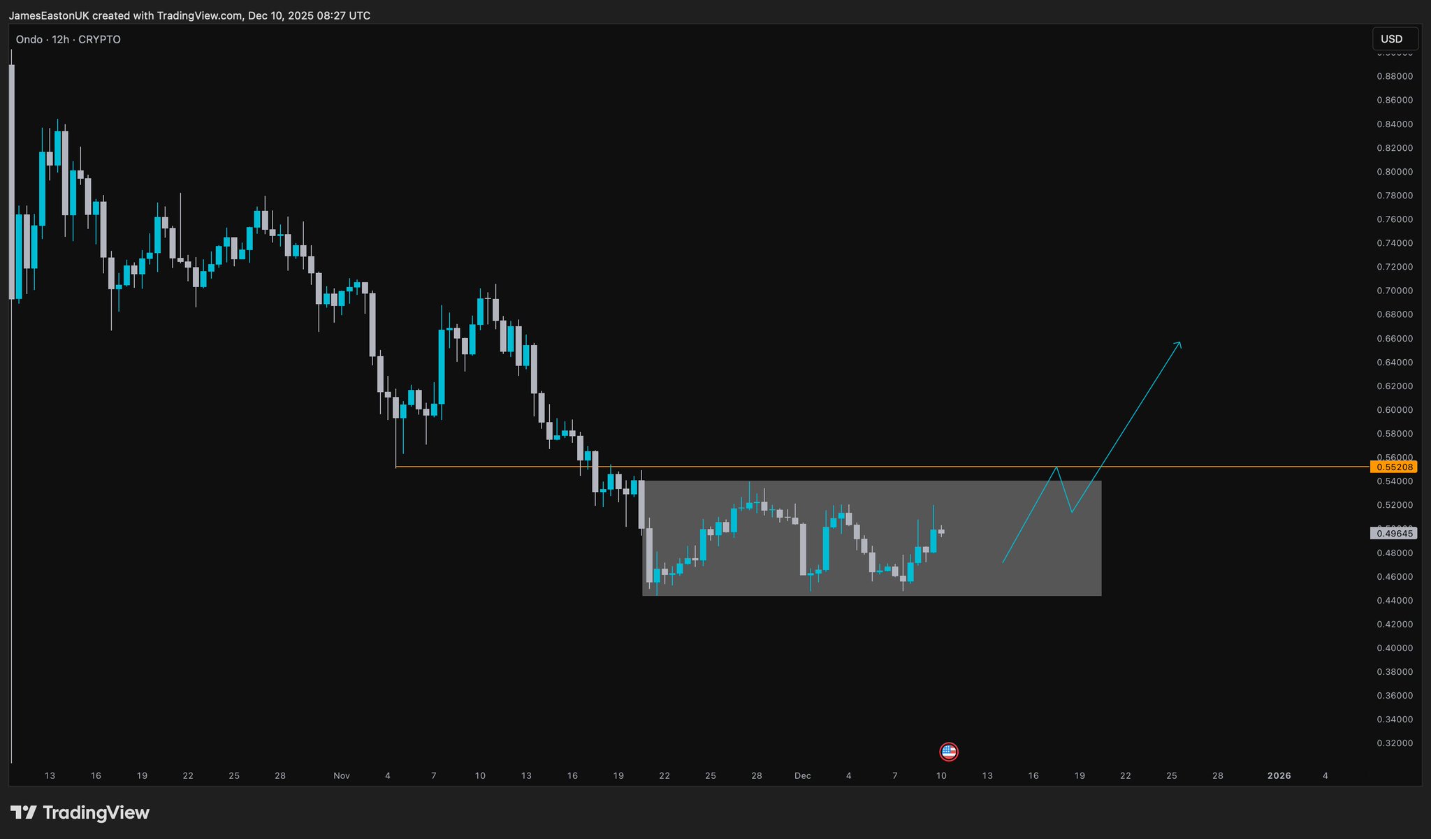 James TA_Analyst Trader A13.86K @JamesEastonUK$ONDO Ridiculously undervalued & a solid range to accumulate imo. Reclaim $0.55 & we are off to the races. https://t.co/8D5NYlgZJ8