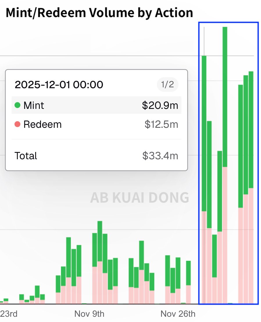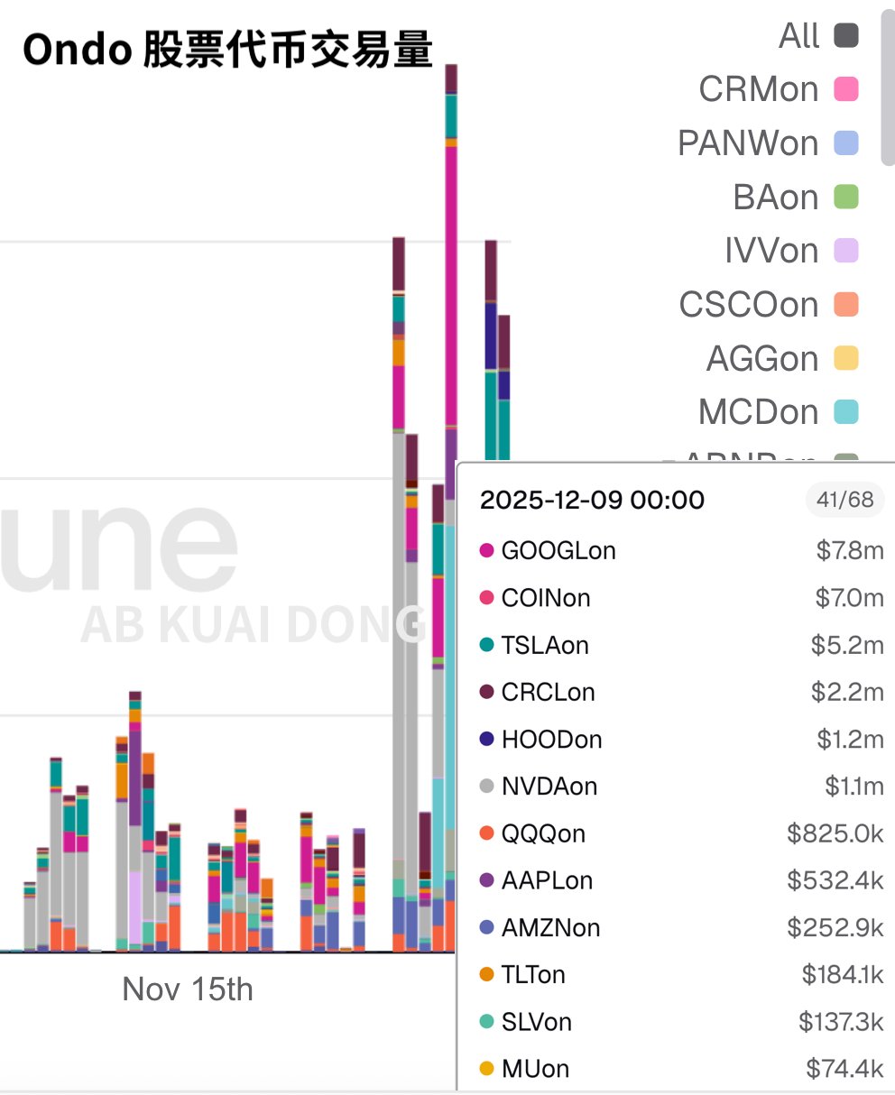 AB Kuai.Dong Researcher Media S92.52K @_FORABSince the end of last month, when Ondo's tokenized stocks were integrated by major exchange wallets and platforms, the on-chain minting volume and corresponding trading volume have remained strong. Current data shows that its daily trading volume on each business day hovers around $25 million, while the on-chain minting scale stays around $15 million per day. Previously, we thought the North American hype about putting everything on-chain was just talk, but recent data shows a clear growth. The officials state that in the first week of December alone, the exchange called Bitget saw Ondo tokenized stock trading volume exceed $88 million, accounting for 73% of the market share. Additional note: Ondo's US‑stock tokens are minted, issued, and matched with broker transactions on-chain to ensure the token price stays in sync with the underlying stock price.