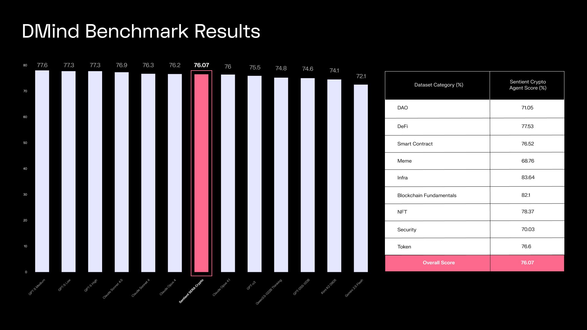 brey Founder Researcher B45.14K @0xBreynHow Benchmarking Worked Sentient evaluated agents using two benchmarks: • DMind Benchmark covers 9 Web3 categories: smart contracts, DeFi, security, tokenomics & more. • Internal Crypto Benchmark real user sourced queries requiring open‑ended reasoning.(Sentient Labs) Result: SERA‑Crypto tops open‑source competitors and rivals proprietary systems in depth and temporal accuracy.