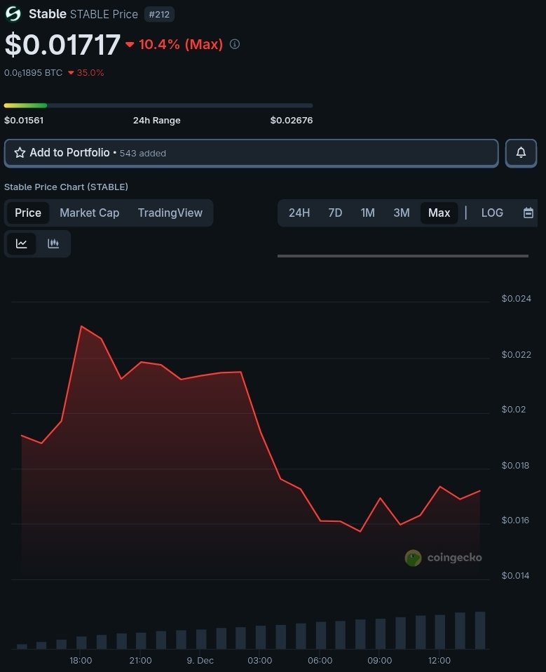 81 2 50.00K 閱讀原文 >釋出後STABLE走勢極度看跌After Stable token was listed, its price plunged 60%, facing a trust crisis and liquidity challenges, and its outlook is bleak.
