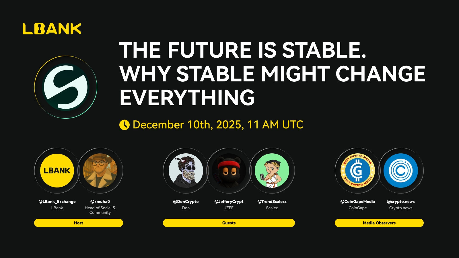 LBank.com D751.60K @LBank_Exchange🔥 Ready for a Space that could flip the script on crypto? Strap in, this one is BIG! 🚀 🎙️ The Future Is Stable: Why $STABLE Might Change Everything 🧠🚀 📅 December 10th 2025 | 🕚 11 AM UTC 🎙️ Hosts: @LBank_Exchange & @xmuha0 🎤 Guests: @DonCrypto @JefferyCrypt @TrendScalezz 📰 Media Observers: @CoinGapeMedia @crypto_news 👉 Set a reminder: https://t.co/XoJs2N1uJe #LBankSpaces #STABLE #Crypto #Web3 #DeFi