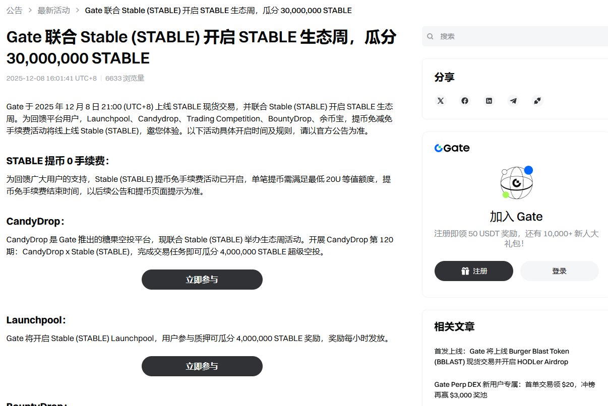 Gol D. REX MemeMax⚡️.edge🦭🌊RIVER Influencer Community_Lead A5.10K @MJk9656It may look like a project trying to capture stable users, but the exchange collaboration event still offers some small gains. Quoting the well‑organized post by @0x_xifeng! This time, @Gate is said to have rolled out especially good events for small‑balance users. Skip the big whales and check this out if you want to steadily earn with small amounts. 1. Bountydrop + Trade Mission Rewards Complete the @stable trade mission to receive tokens in this event. For small‑balance users, even the modest rewards are pretty decent. 2. Launchpool A good option for GT holders, BTC holders, and those who don’t want to sell Stable. A total of 4 million Stable rewards are at stake, just deposit and harvest. 3. 여비보 (Deposit Product) A whopping 8 million Stable rewards. If the price already looks at the bottom, you don’t want to sell and prefer to hold, a 1‑week lock‑up can target around 200% annualized return. 4. Trading Competition Only for those proficient in futures trading. Not recommended for beginners. Otherwise, if losses exceed the prize, it’ll be a tearful experience. I’ll attach the relevant links in the comments!