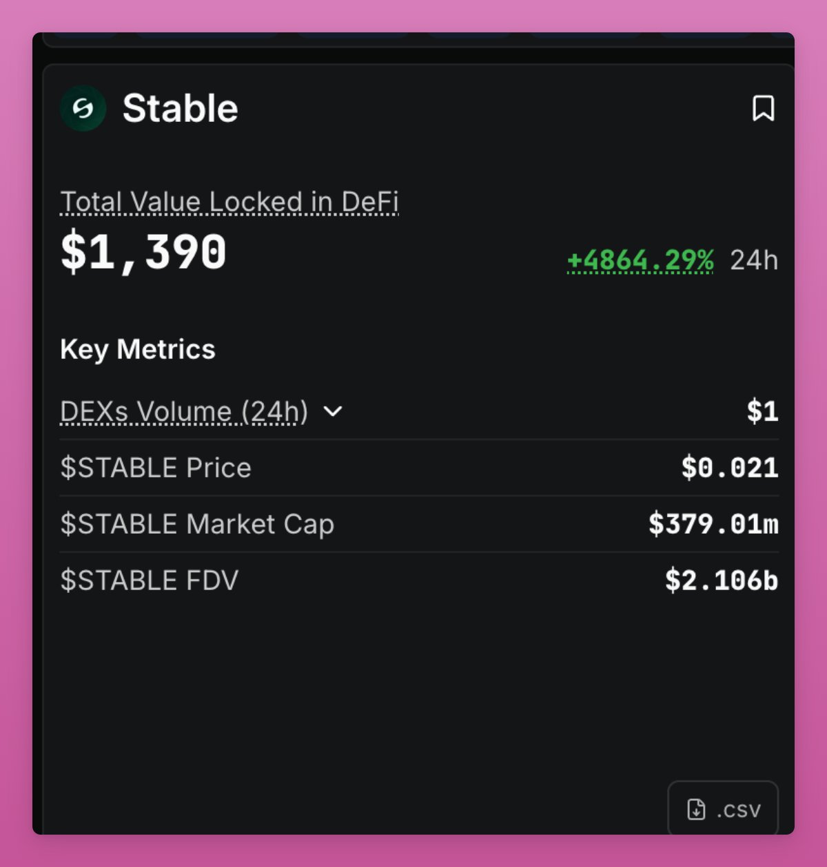 - 概要STABLE mainnet launched two days ago, price up 10.9%, TVL 1.4k, 3.7k new addresses, airdrop annualized ~18%, social heat plummeted.